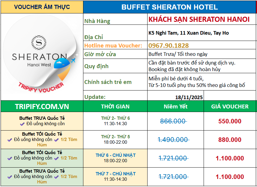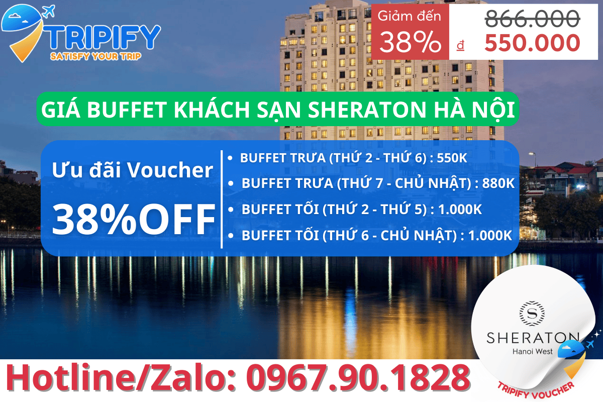BUFFET KHÁCH SẠN SHERATON - ƯU ĐÃI VOUCHER CHỈ 550K. Nhà hàng: Oven D'or Restaurant (Sheraton Hanoi West) Địa chỉ: Sheraton Hanoi Hotel, 11 Xuân Diệu, Phường Quảng An, Quận Tây Hồ, Hà Nội Điện thoại: 0967.90.1828. Giờ mở cửa: Buffet trưa: 11h00 – 14h30, buffet tối: 18h00 – 22h00